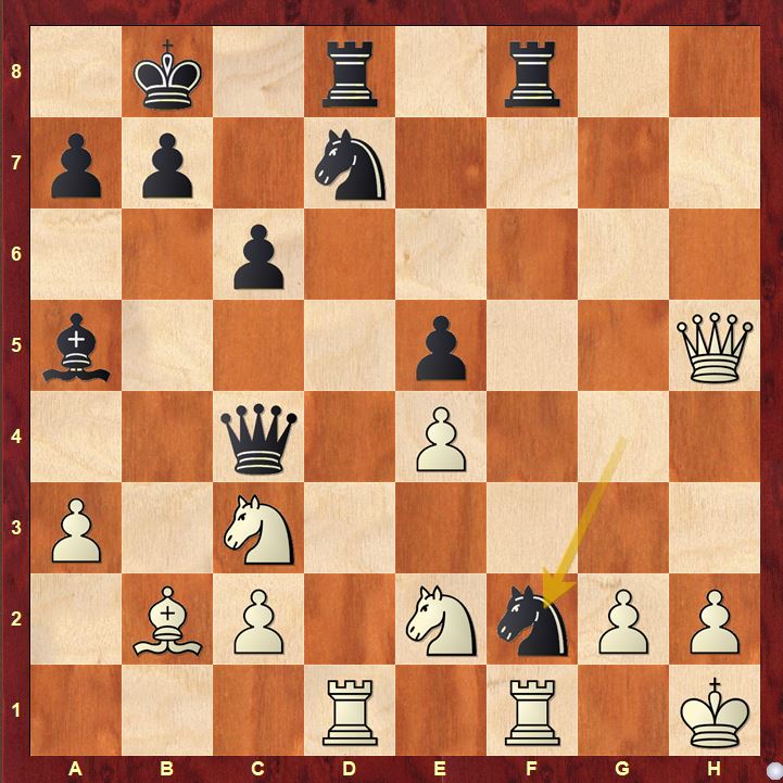 23.Rxf2 Rxf2 24.h3 Qg8 25.Rg1 Qg7 26.Nd1 Rf7 27.Ne3 Rf2 28.Ng4 Rh8 29.Qxh8+ Qxh8 30.Nxf2 Bb6