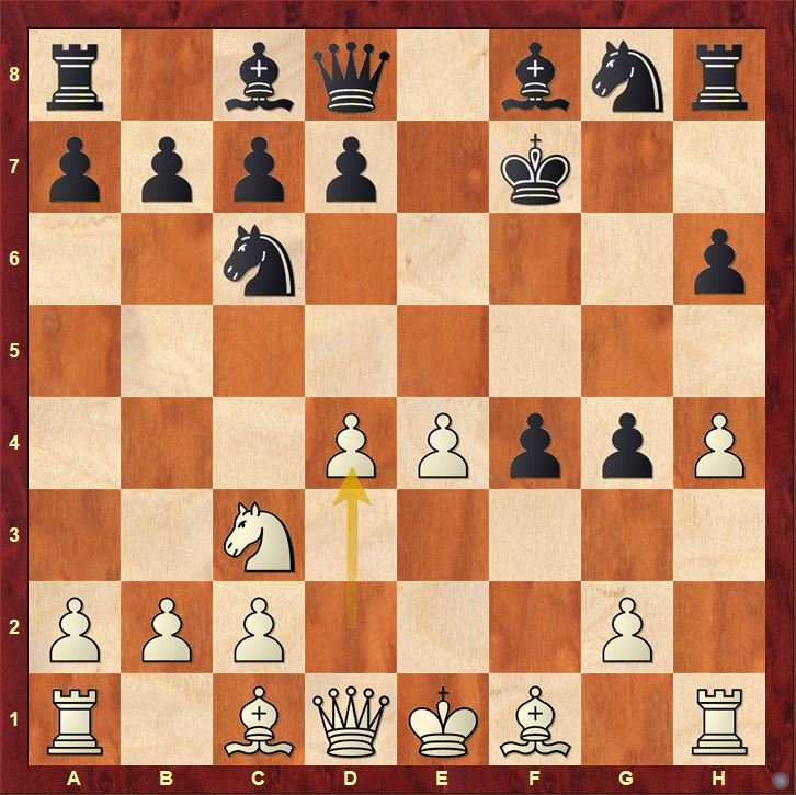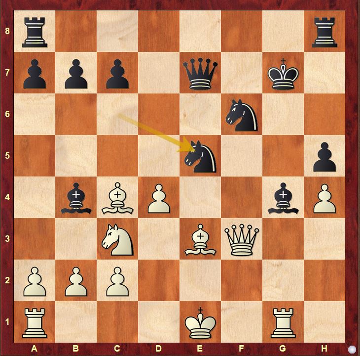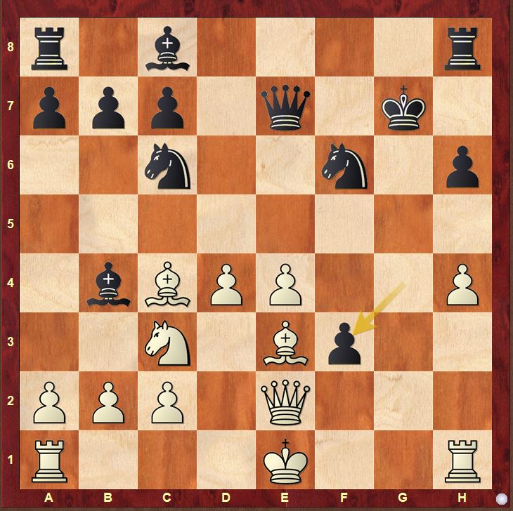 Bb4 12.Be3 Nf6 13.Bc4 Qe7 14.Qe2 gxf3 15.Qxf3 Bg4 16.Rg1 h5 17.e5 Nxe5