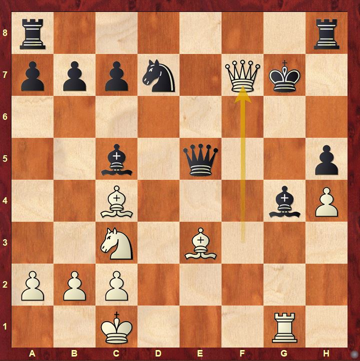 18.dxe5 Qxe5 19.0-0-0 Bc5 20.Rd7+ Nxd7 21.Qf7#