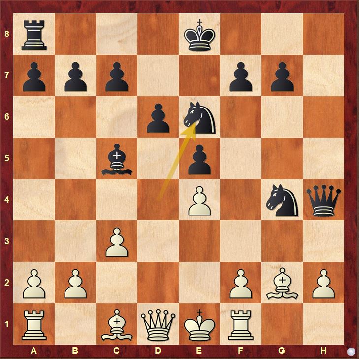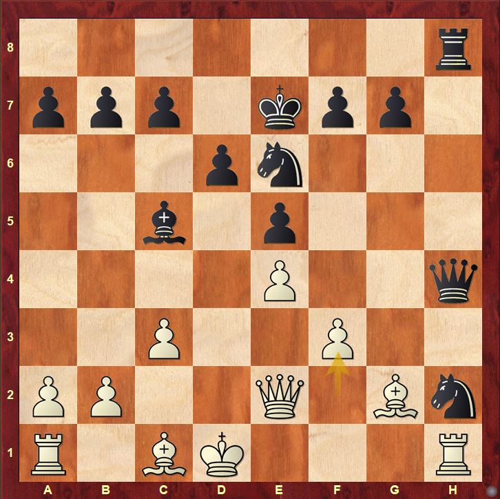 14.Qe2 Nxh2 15.Rh1 Ke7 16.Kd1 Rh8 17.f3